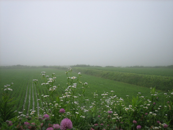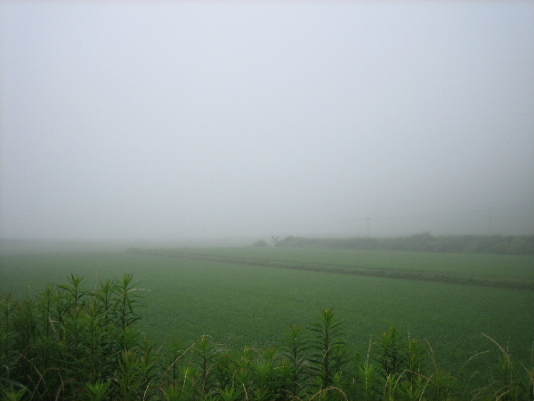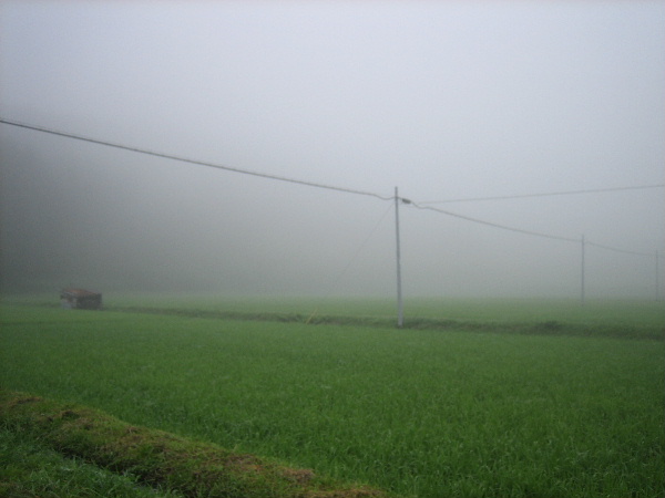 今朝はモヤに包まれ、幻想的な田園風景の中